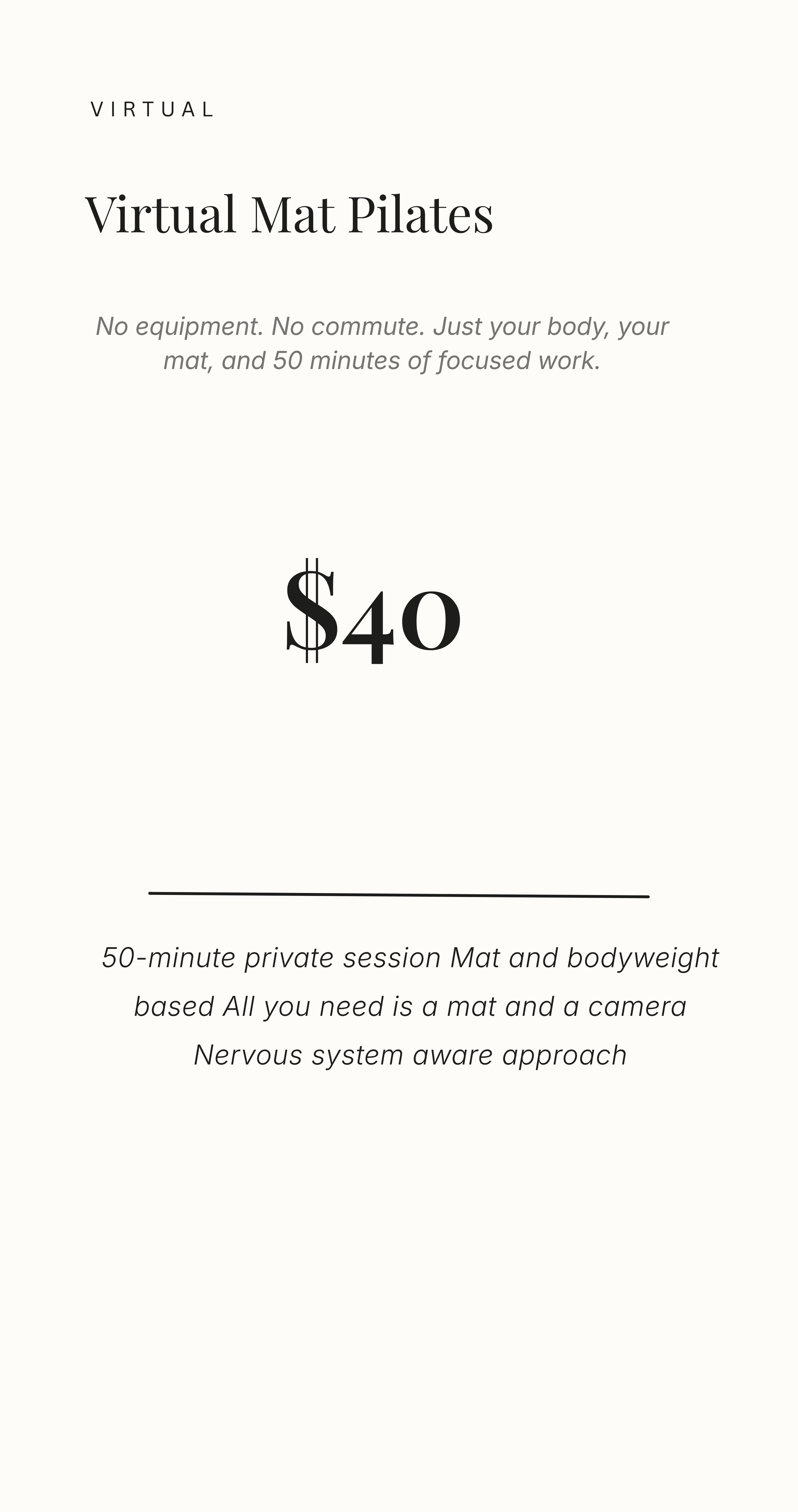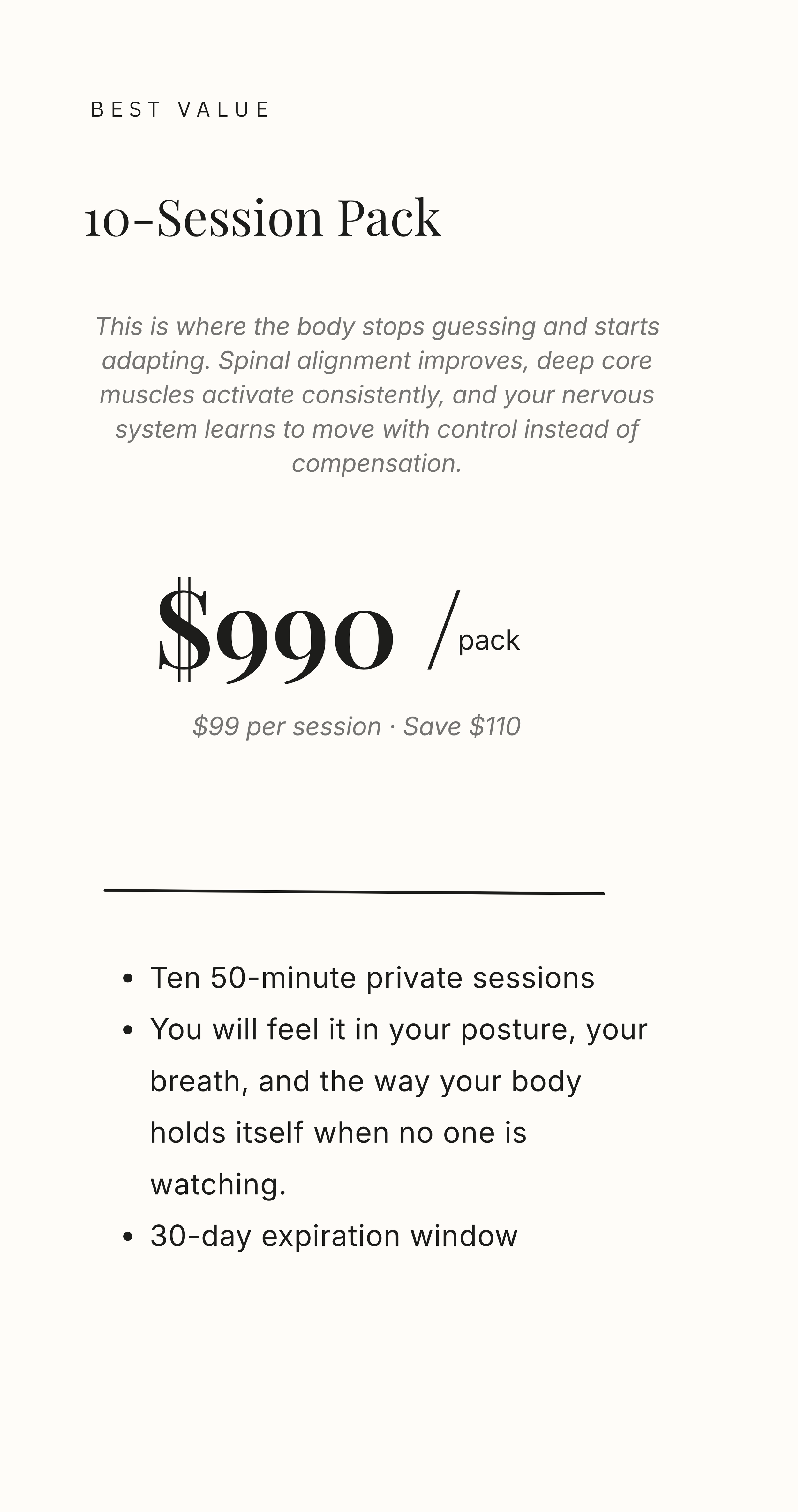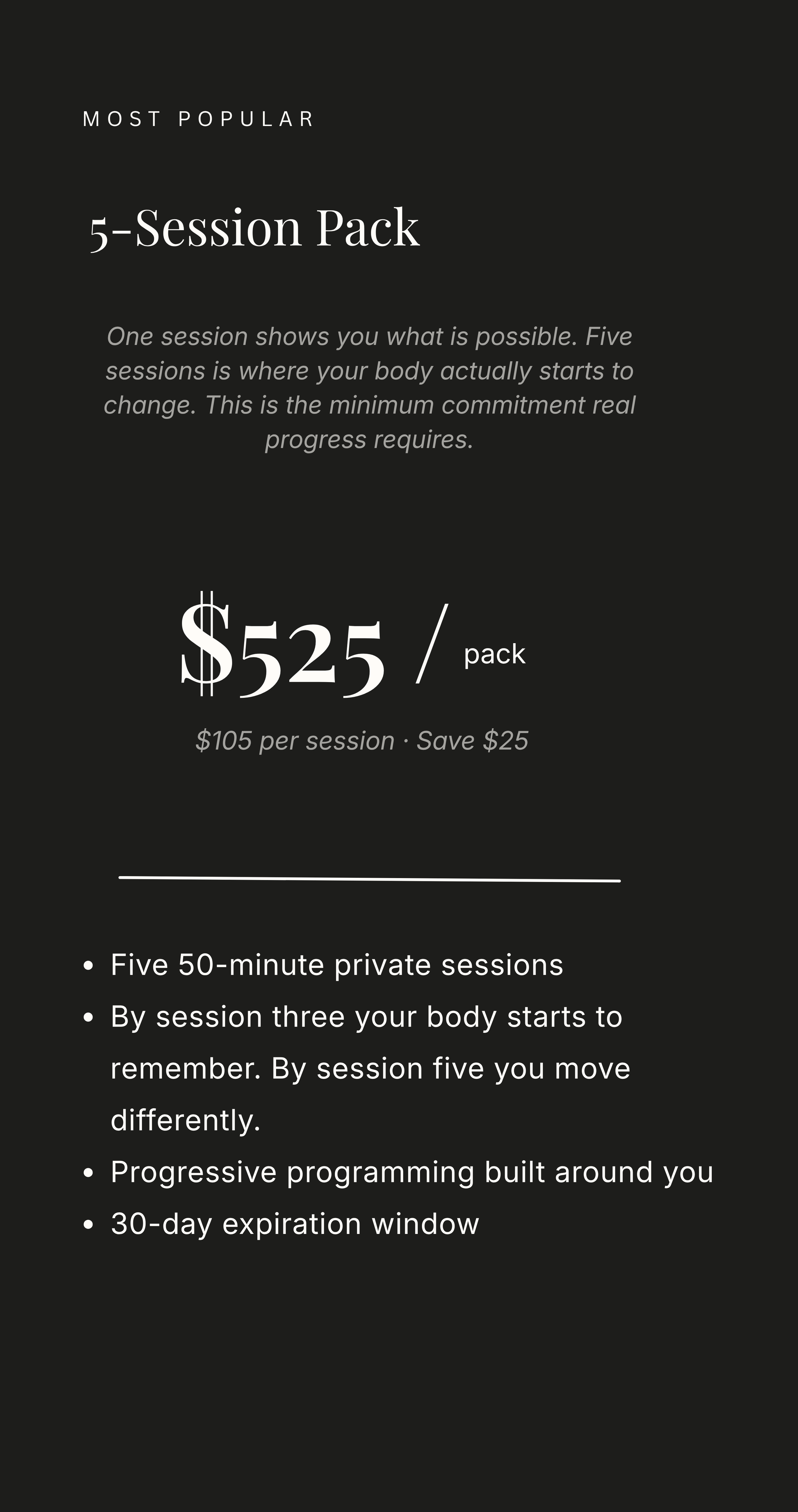 1:1 in person sessions designed around your body, your goals, and how you want to feel. Each session is intentional, focused, and fully personalized.